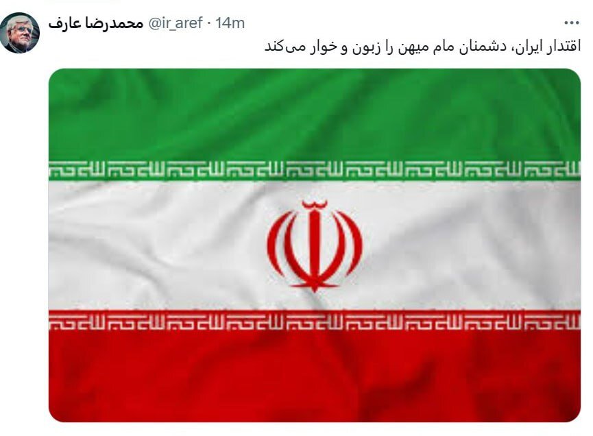 به گزارش خبرگزاری مهر، محمدرضا عارف در واکنش به حوادث بامداد امروز شنبه ۵ آبان ۱۴۰۳ با انتشار تصویری از پرچم ایران در حساب کاربری خود در شبکه اجتماعی ایکس، نوشت: اقتدار ایران، دشمنان مام میهن را زبون و خوار میکند.